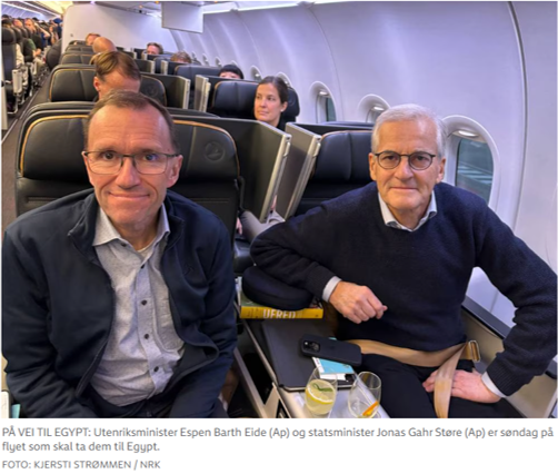 Nå når en avtale er et faktum, sitter statsminister Jonas Gahr Støre og utenriksminister Espen Barth Eide på businessklasse, med drinker og snitter, på vei til et toppmøte i Egypt. De skal delta i feiringen av en fred de aldri trodde på, og som de aktivt har motarbeidet.