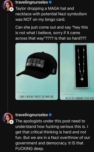I sosiale medier florerer det av innlegg og videoer med forklaringer om hvorfor smykket er nazistisk og påstander om at Swift har gjort dette med overlegg.