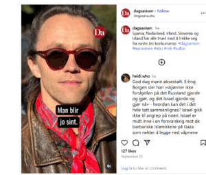 Virtue-signaliseringen når sitt klimaks når hun annonserer at inntektene fra Marit Bergmans låt skal doneres til UNRWA, et byrå som hadde ansatte som deltok i myrderiene på Nova-festivalen 7. oktober under Hamas-angrepet. Men angår dét henne?