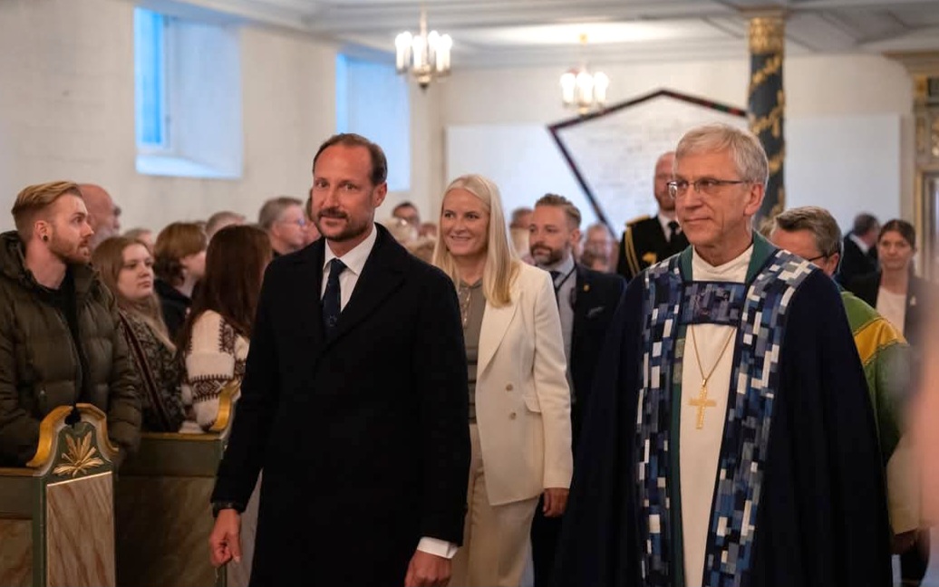 Kronprinsparet deltok på kveldsmessen for unnskyldning til skeive i Oslo domkirke. Kronprins Haakon og kronprinsesse Mette-Marit ble ledsaget inn av preses Olav Fykse Tveit. Foto: Den norske kirke.