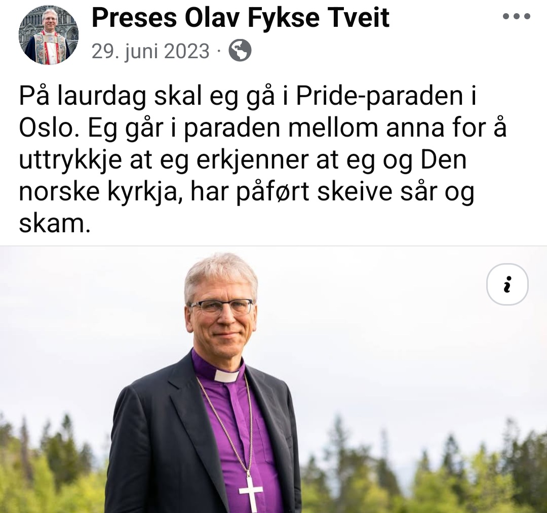 Den norske kirke har ført en kamp for de «skeive» lenge før de nå kom med en unnskyldning. Prester, biskoper og preses har gått i Pride-tog. De har attpåtil en egen avdeling for slikt; Kirken på Pride. I oktober 2024 gikk preses Fykse Tveit imot felleskristen erklæring om kjønn, for heller å støtte skeive enn tradisjonelt kristne. Erklæringen slo blant annet fast god, gammel kristendom, som at det bare finnes to kjønn og at ekteskapet er forbeholdt mann og kvinne. Biskopenes leder sa til Vårt Land at slikt var dårlig bruk av bibeltekster, og at den satte teologien som fag i vanry. Dette gjør de vel vitende om at dette er sårende og traumatiserende for dem det gjelder mest, mente preses.