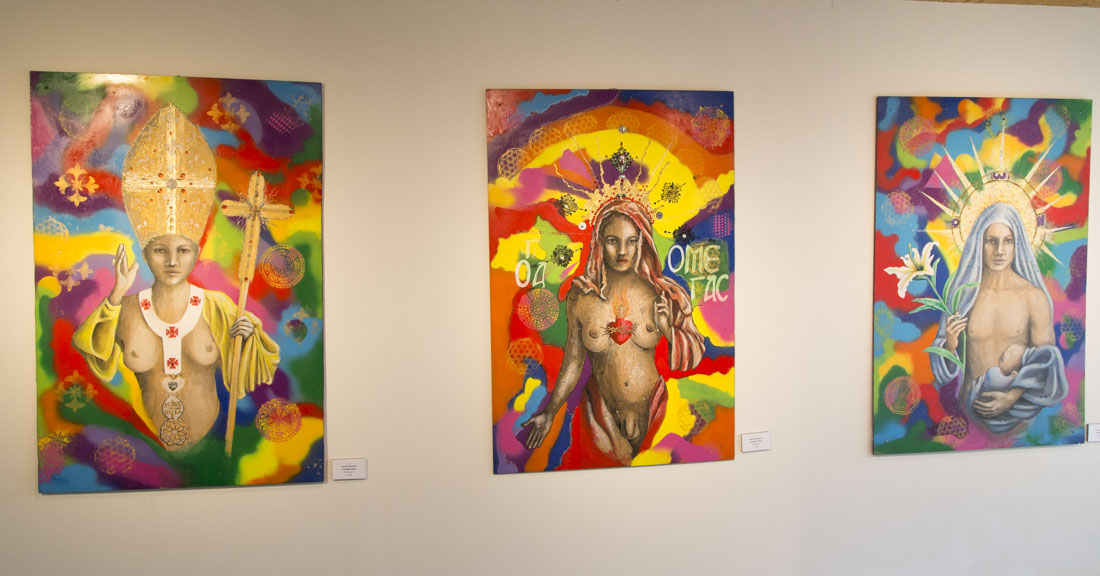 Olsokutstillingen på Stiklestad i 2022 ble åpnet av preses Olav Fykse Tveit. Her bilder av Tove-Mari Odderdal og Trine Midtlie Elmholt. Ifølge katalogen «utfordret kunstnerne kjønnsstereotypier ved å bruke kjente skikkelser i andre kjønnsuttrykk. I bildene kan en finne en del symbolikk fra Bibelen og kristne ikoner.» Foto: Bente Haarstad.