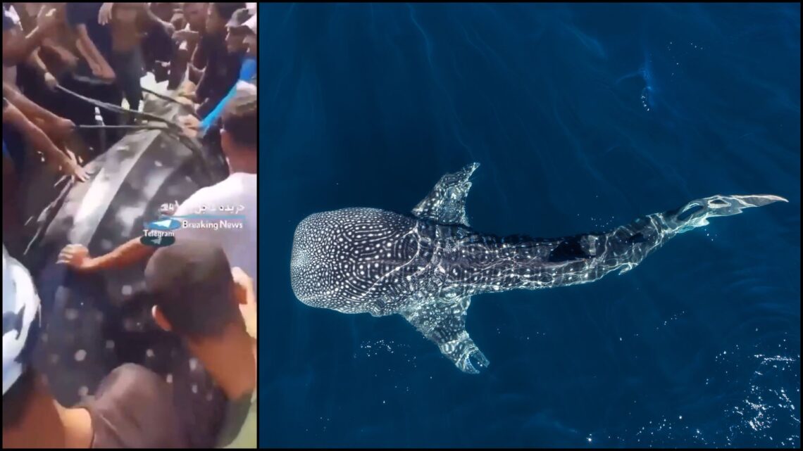 I en film som spres i sosiale medier ser man hvalhaien bli dratt i land av innbyggere langs kysten av byen Khan Yunis som ligger på Gazastripen.