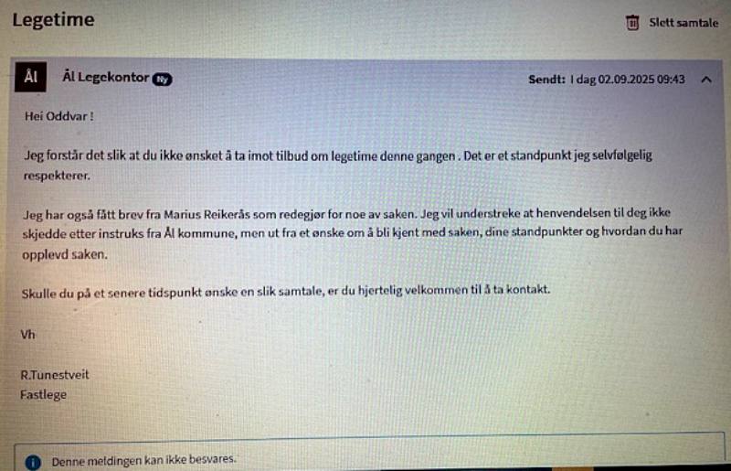 Ny melding fra lege Tunestveit ved Ål legekontor. (Foto: Privat.)