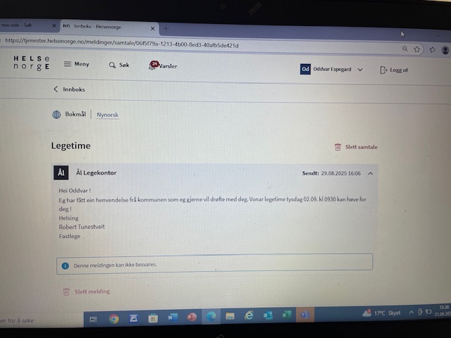 Innkallelse til legetime hos fastlege Robert Tunestveit ved Ål legekontor, sendt til Oddvar Espegards innboks på Helsenorge.no (Foto: Privat)