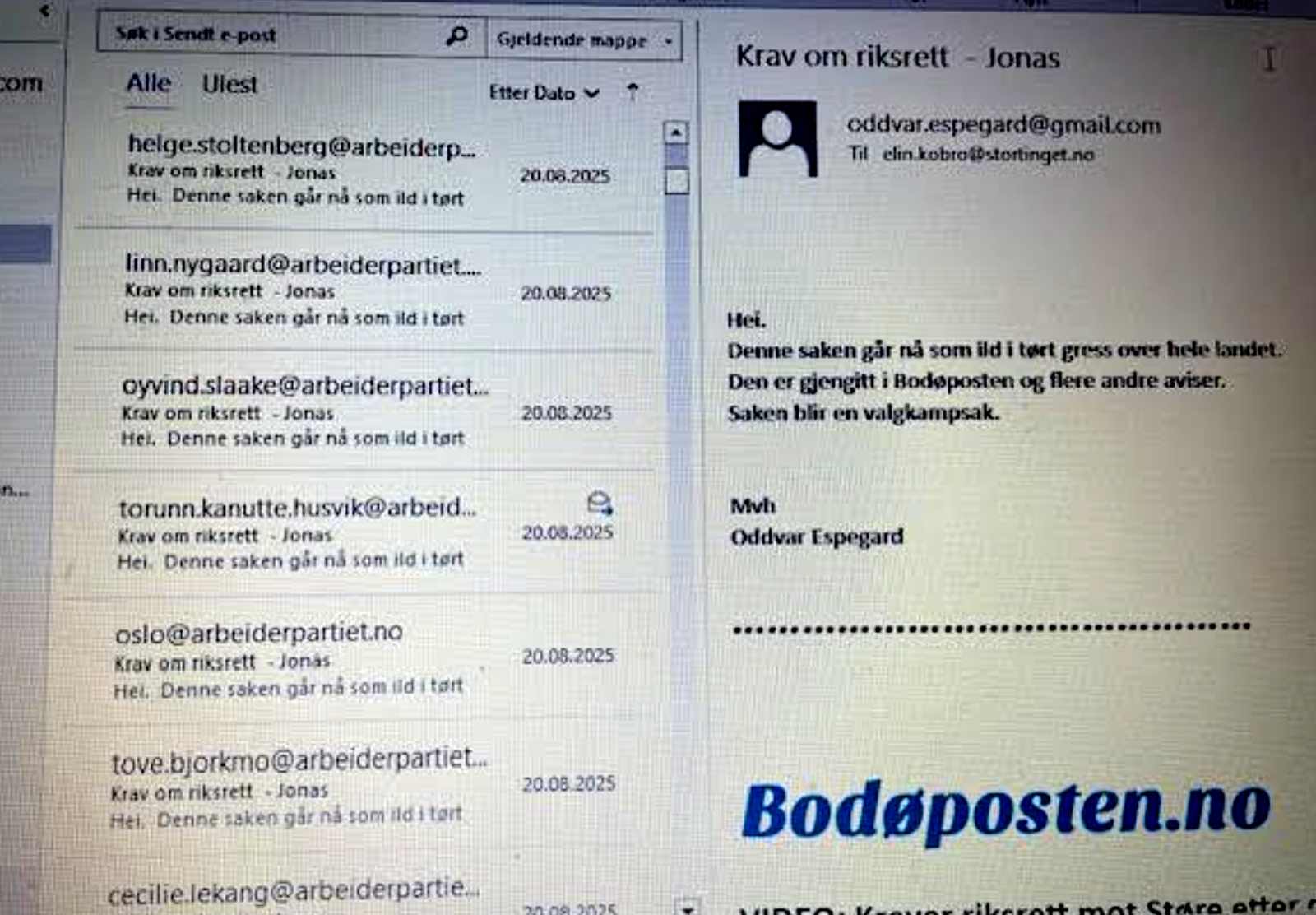 Resten av e-posten gjengir Bodøpostens artikkel om riksrettskravet mot statsminister Jonas Gahr Støre som Vinsrygg har sendt Stortingets kontrollkomite på bakgrunn av Shada-saken.