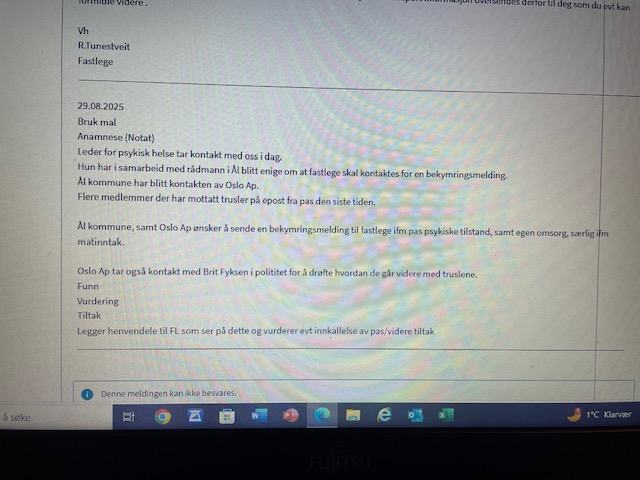 Leder for psykisk helse tar kontakt med oss i dag. Hun har i samarbeid med rådmann i Ål blitt enige om at fastlege skal kontaktes for en bekymringsmelding. Ål kommune har blitt kontaktet av Oslo Arbeiderparti (Ap). Flere medlemmer der har mottatt trusler på e-post fra pas. den siste tiden.