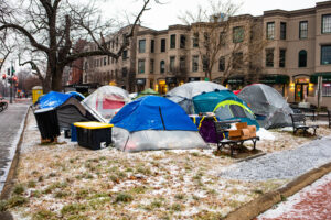 Hjemløse telt dekket av is i en bypark i Washington DC. Foto: Shutterstock.