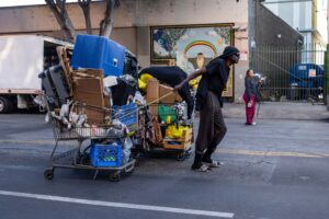 En hjemløs mann med sine eiendeler på Skid Row i Los Angeles i 2024. Foto: Shutterstock.