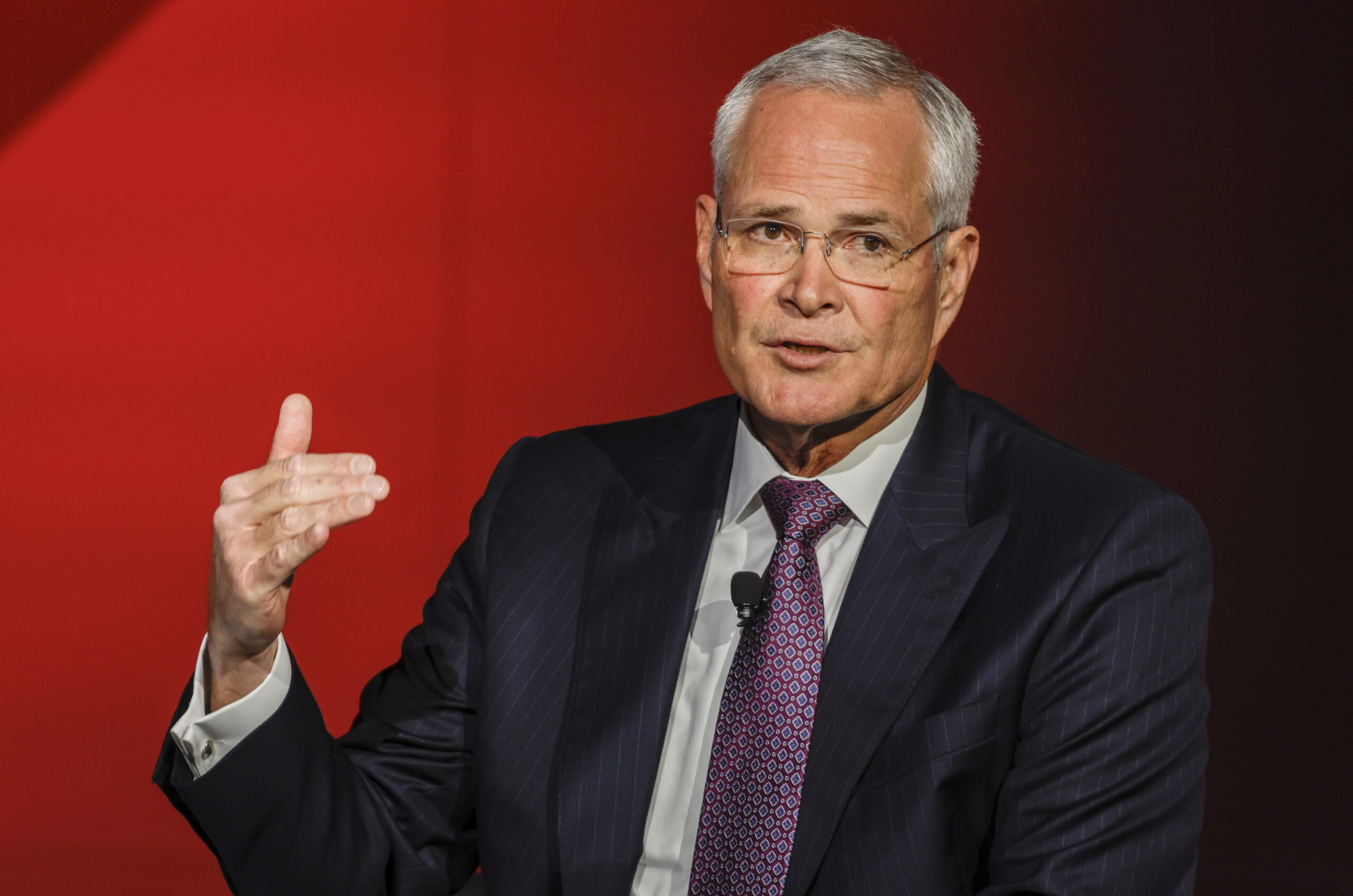 Exxon-sjef Darren Woods deltar i en paneldebatt under World Petroleum Congress i Calgary den 18. september 2023. Foto: Jeff McIntosh / The Canadian Press via AP / NTB.