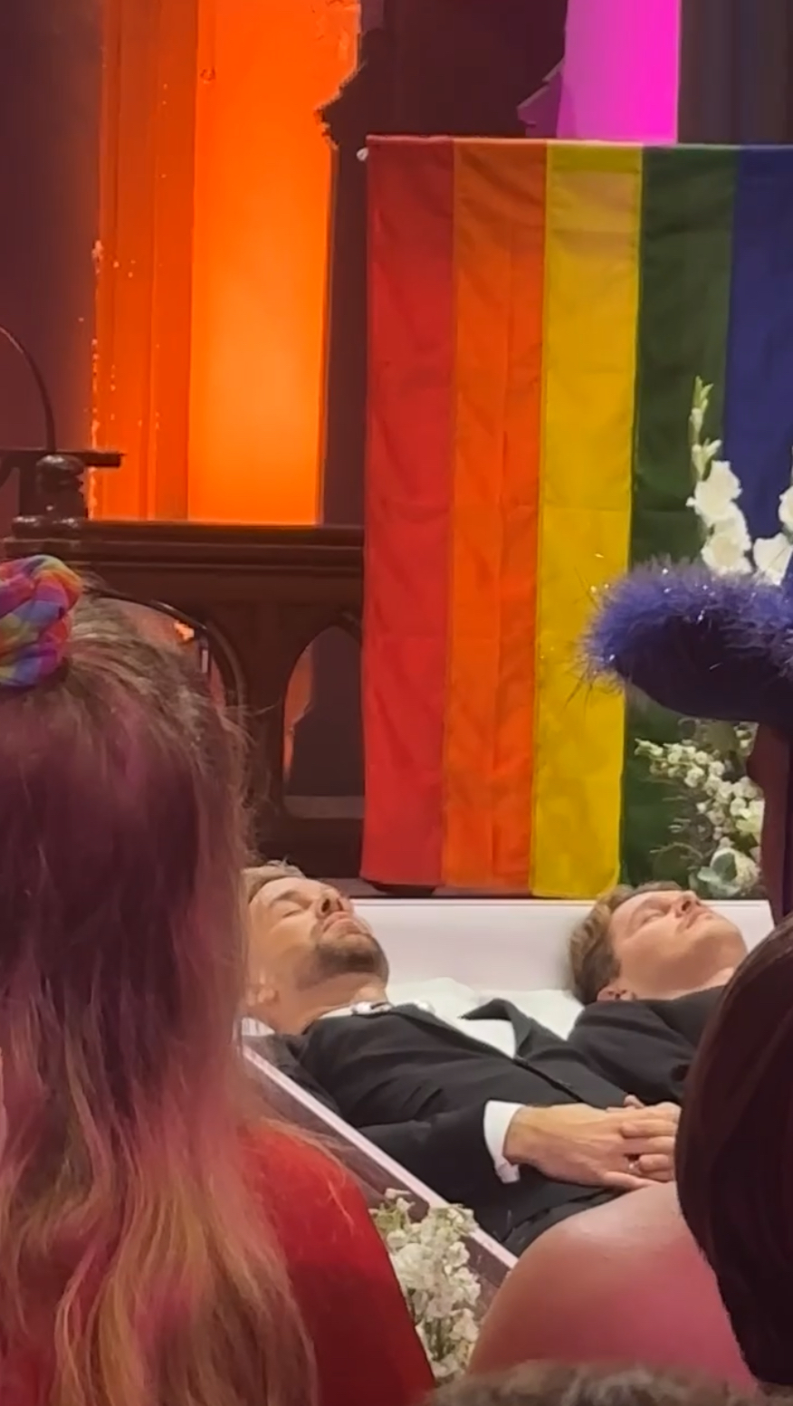 I denne begravelsen skal det være taler, show, dans og sang om dem som begraves. For kvelden var det den kjente homoduoen Vegard Harm og Morten Hegseth som lå i kisten. Hegseth har tidligere markert seg med grove uttalelser foran barn.