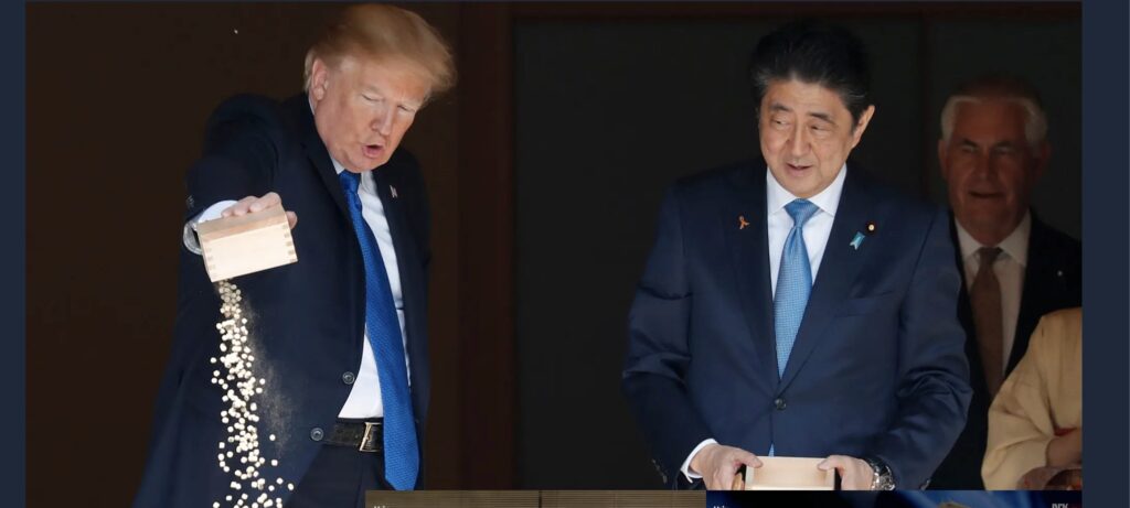 Det avgjørende var selvsagt klippet bort: Det var statsminister Shinzo Abe som først løftet bort skjeen og tømte hele boksen. Trump gjorde bare det samme som verten – helt i tråd med protokoll og høflighet.
