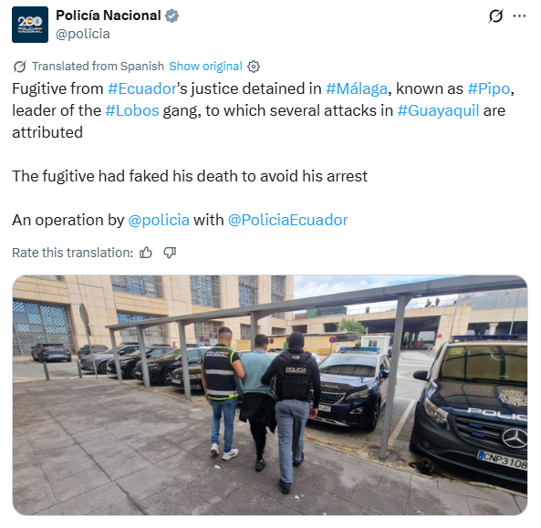 Wilmer Chavarria, også kjent som «Pipo», ble pågrepet i Malaga i en felles operasjon mellom spansk og ecuadoriansk politi, opplyser Spanias nasjonale politi på X.