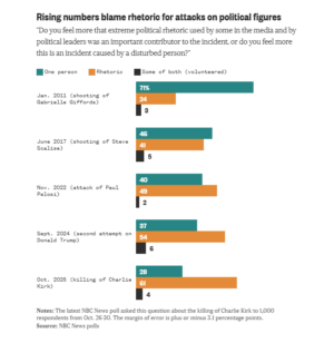 Drapet på Charlie Kirk markerer et sjeldent tilfelle der flertall på tvers av partiene er enige om at retorikk spilte en rolle, første gang i NBCs 15-årige målinger over fem politiske angrep.