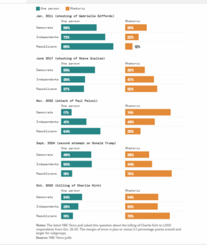 For første gang mener et flertall på tvers av partiene (61 %) at ekstrem retorikk bidro til drapet på Charlie Kirk, opp fra 24 % i 2011 etter attentatet mot Gabrielle Giffords.