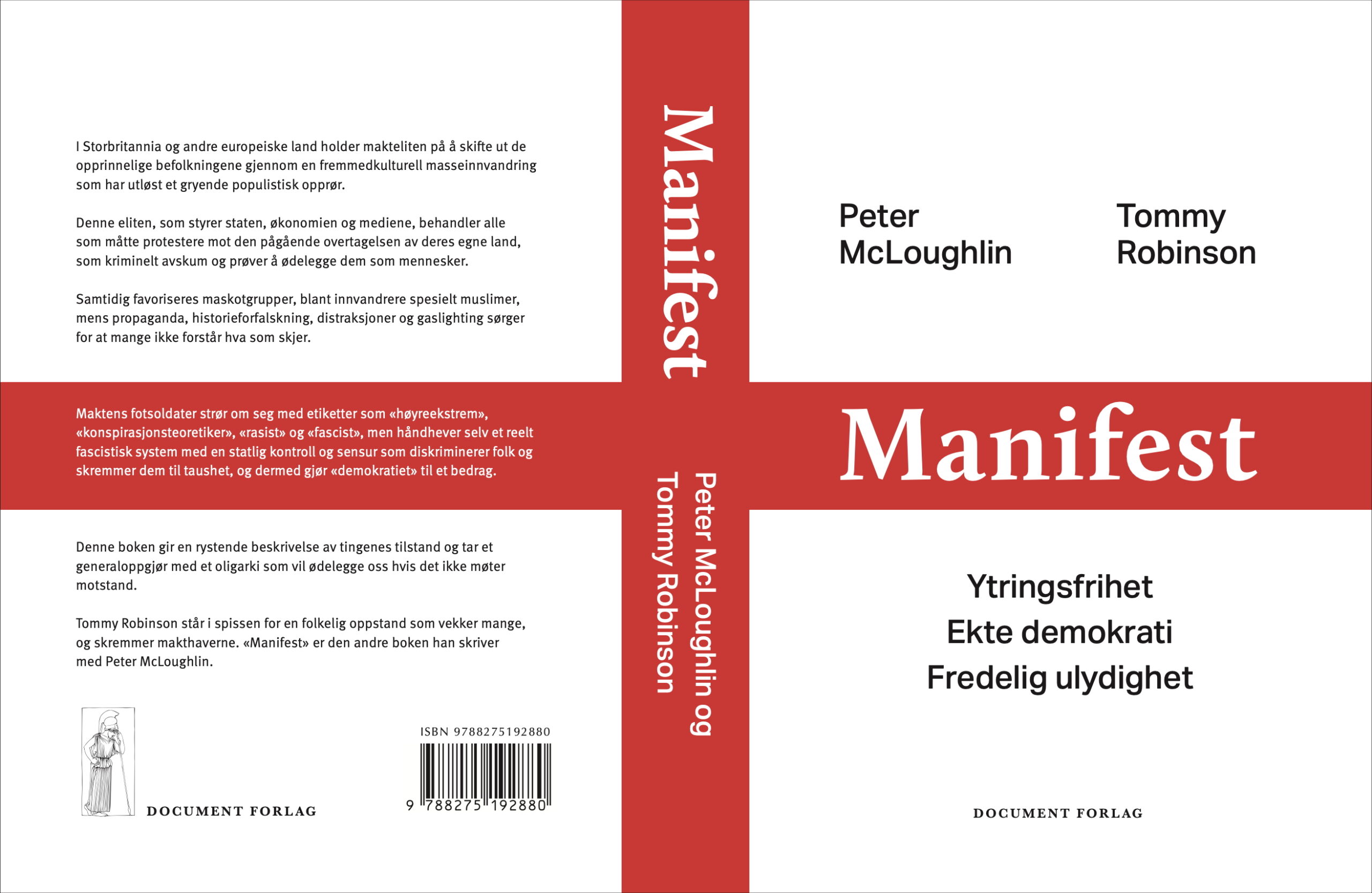 «Manifest» er den andre boken Robinson og McLoughlin skriver sammen. De har kjent hverandre i mange år, har samarbeidet tett og står begge inne for den. Boken gir altså en rystende beskrivelse av tingenes tilstand og er et uvanlig ramsalt oppgjør med en maktelite som vil ødelegge oss hvis den ikke møter motstand. Og det må den, formaner forfatterne, som også forklarer hvordan. Det begynner med ikke å la seg manipulere. Det springende punkt er om vi er villig til å ta ubehaget ved å forhindre Oligarkiet i å utslette Vestens nasjoner. Forfatterne flagger for sin egen med omslaget til boken.