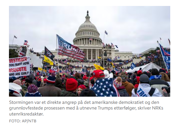 Så får vi en repetisjon av den partiske 6. januar-komiteen fra Representantenes hus, som opererer på samme vis som NRK. Bare én side får komme til orde. Mikkelsen legger tjukt på: