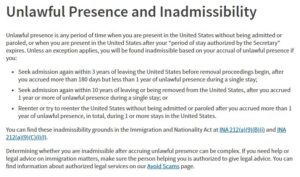 Har du hatt opphold ulovlig i mer enn seks måneder, og deretter forlater landet, får du automatisk innreiseforbud i tre år. Har du vært ulovlig i mer enn ett år, blir forbudet ti år fra det øyeblikket du forlater USA.