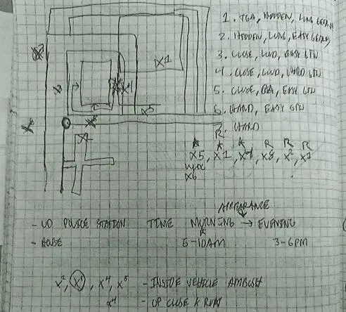 Notatene inneholdt en tegning av en bygning med inngangs- og utgangspunkter, hvor det sto «UD Police Station» – politiet ved University of Delaware.