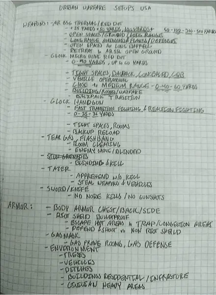 Notater med overskriften: Urban Warfare Setups USA.