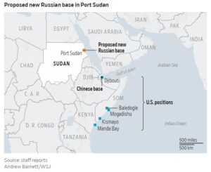 I februar uttalte Sudans utenriksminister Ali Youssef at landet ville tillate Russland å bygge en marinebase, uten å spesifisere vilkårene i avtalen. En havn ved Rødehavet kan gi Kreml en avgjørende fordel i de strategiske farvannene, skriver Wall Street Journal.