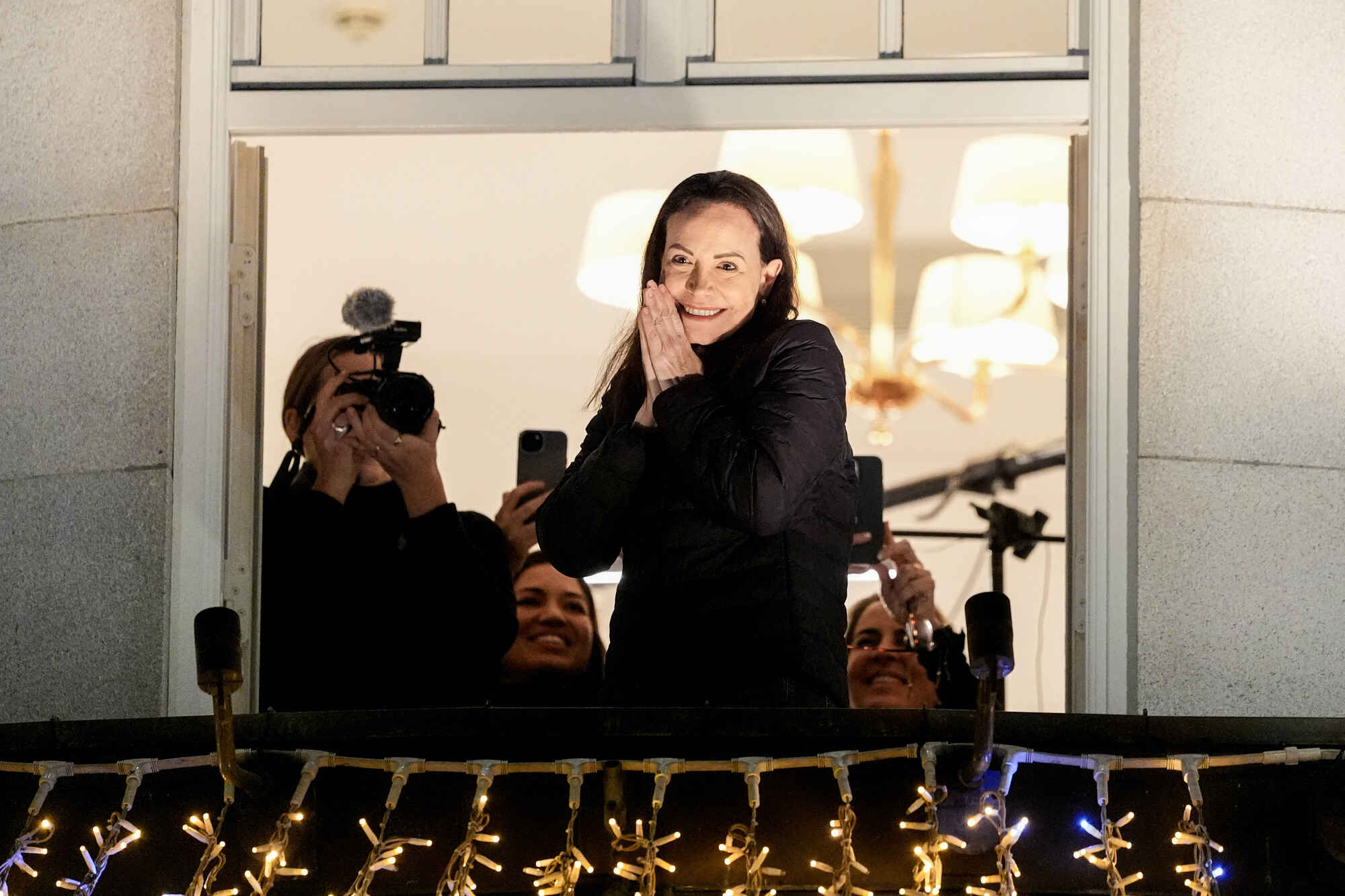 Vinneren av Nobels fredspris for 2025, Maria Corina Machado, på balkongen på Grand Hotel i Oslo natt til 11. desember 2025. Foto: Lise Åserud / NTB.