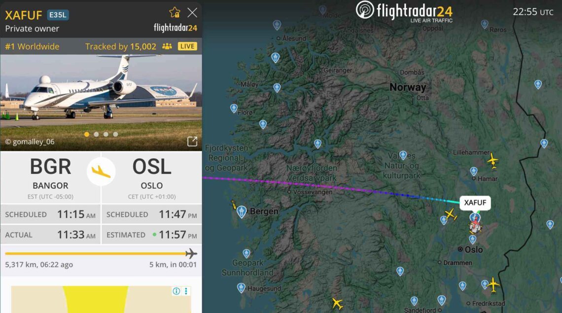Onsdag kveld, like minutter før midnatt, var fredsprisvinneren på vei inn over Hurdal på vei mot Gardermoen i en Embraer privatjet. Mer enn 15.000 mennesker fulgte flyet på FlightRadar24. Det gjorde den til verdens mest fulgte flytur akkurat da.