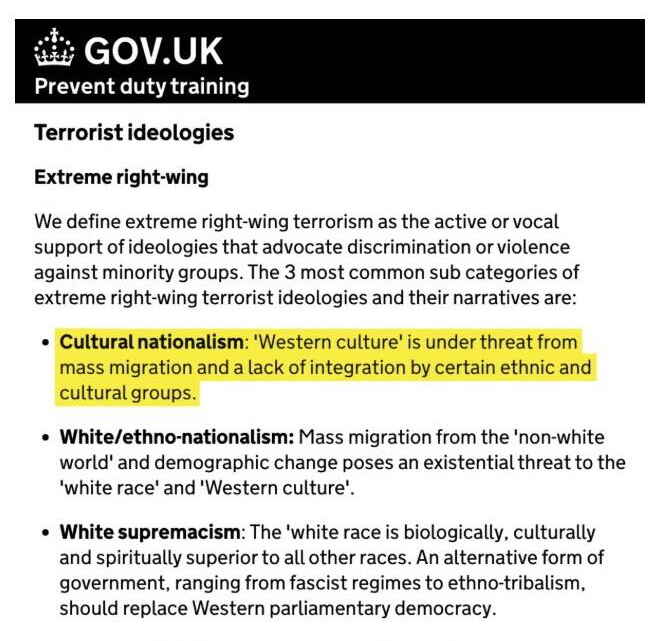 Den 6. juni 2025 kunne The Telegraph avsløre at den britiske regjeringens antiterror-program Prevent anser bekymring for masseinnvandring for å være en høyreekstrem terrorideologi.