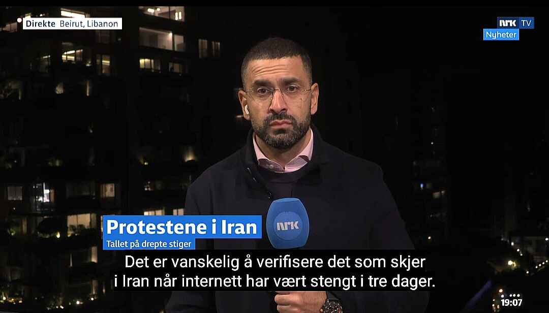 – Myndighetene tegner et helt annet bilde og sier det er væpnede opprørere som jobber på oppdrag for utenlandske etterretningstjenester, som USAs og Israels etterretningstjeneste. At disse skyter mot sikkerhetsstyrkene, og at de har drept hundre iranske sikkerhetsfolk. Og at de som tenner på offentlige bygg, moskeer og banker, de kommer ikke til å bli vist noen som helst nåde, sier myndighetene.
