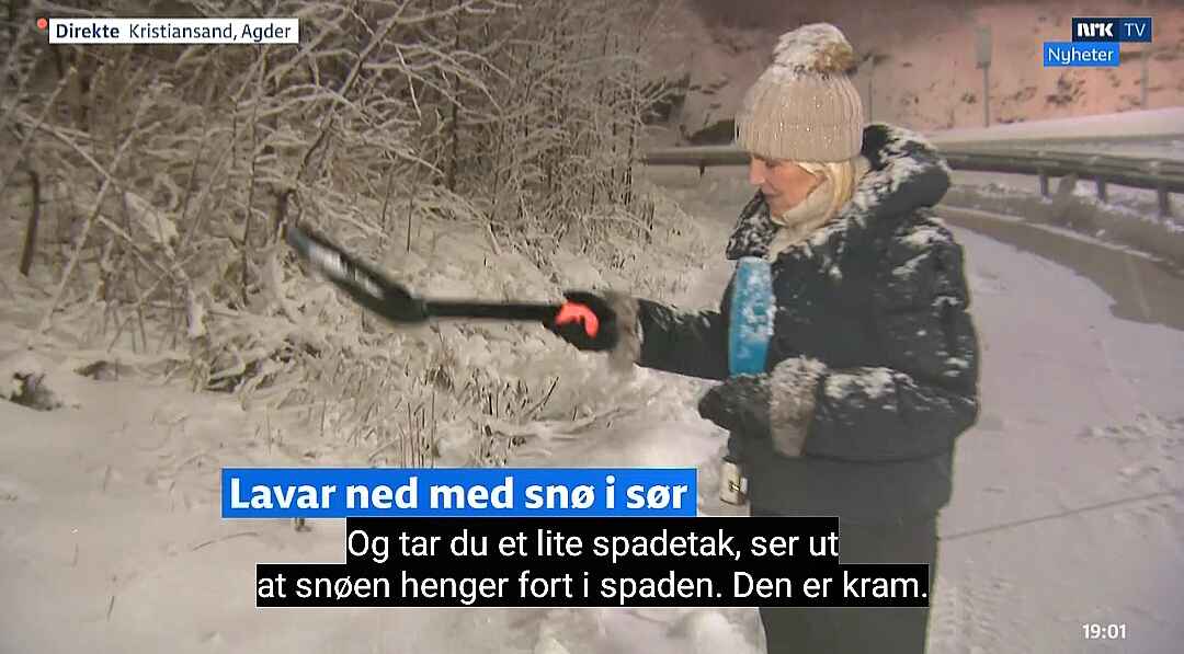 Deretter satte de over til Siv Kristin Sællmann i Kristiansand og en dramatisk reportasje om at det var falt noen centimeter snø, og om at bergingsbiler halte biler opp av grøfta. Jeg vet ikke hva folk nord for Sinsenkrysset synes om dramatikken i det at et mulig væromslag kunne gjøre snøen kram. Innslaget varte i cirka fem minutter, og reporteren kunne med en liten spade demonstrere at snøen faktisk holdt på å bli faretruende kram, og da angivelig umedgjørlig.