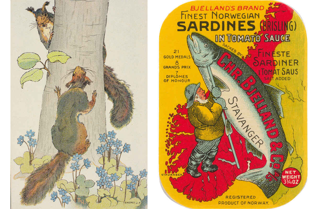 Thorolf Holmboe, Postkort med ekorn. Foto: Nasjonalbiblioteket. «Iddis», Etikett til Bjellands Finest Norwegian Sardines (ca. 1950) Foto: Nasjonalmuseet / Annar Bjørgli.