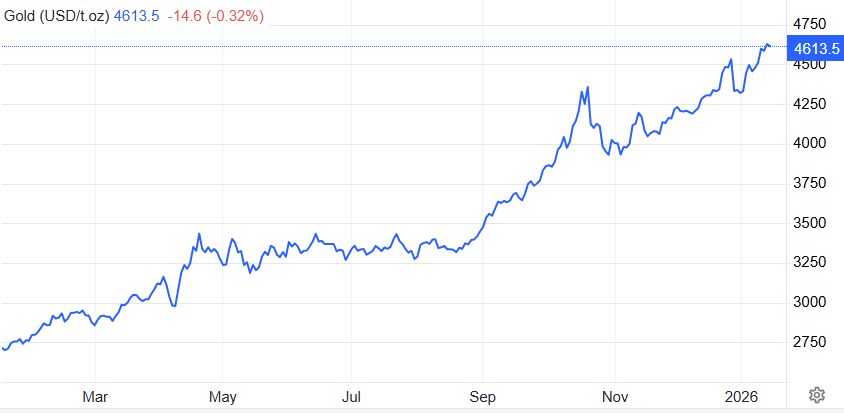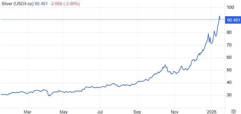 I januar for ett år siden kostet en unse gull 2700 dollar, ifølge Trading Economics. I dag omsettes gullet for over 4600 dollar pr. unse, som er ca. 31,1 gram. Sølvet har i samme tidsperiode økt fra 30 til over 90 dollar pr. unse.