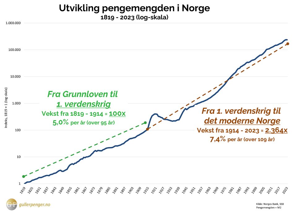 Siden Norges bank opphevet «gullinnløsningsplikten», også kalt gullstandarden, i 1914 på grunn av utbruddet av første verdenskrig, har pengemengden økt med 7,4 prosent i gjennomsnitt pr. år. Konsumprisindeksen i samme periode økte med 3,9 prosent, ifølge SSN.