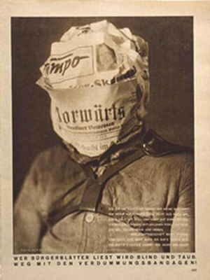John Heartfield Whoever reads bourgeois newspapers becomes blind and deaf: away with the stultifying bandages! Arbeiter-Illustrierte Zeitung (AIZ) 9. no. 6 (1930)