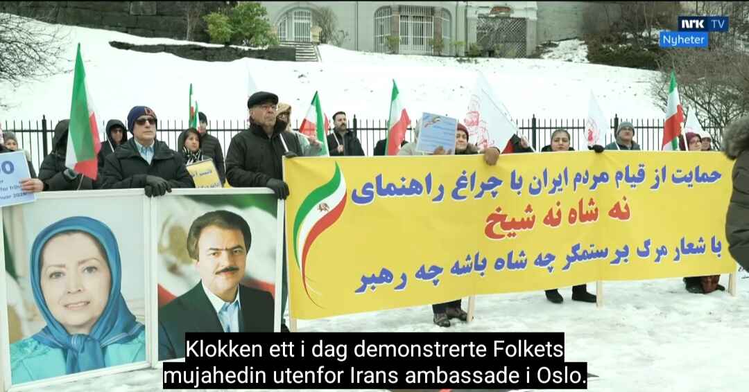 Fra NRKs reportasje i Dagsrevyen om Folkets mujahedin, som demonstrerte ved Irans ambassade i Oslo lørdag 17. januar 2025. MEK hadde med bilder av Maryan Rajavi, Det nasjonale iranske motstandsrådet (NCRI), og ektemannen Masud Rajavi, militær leder for Folkets Mujahedin. Foto: Skjermbilde fra NRK.