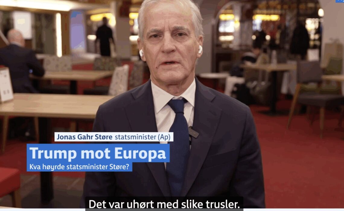 Jonas Gahr Støre driver polemikk mot Trump fra Davos når han blir spurt om en vurdering av Trumps tale. Han sier Trump virker besatt av Grønland, når alle som hørte talen, forsto at det handler om geostrategiske realiteter. Norge har en lang kyst og store havområder å forsvare, og er helt avhengig av USA, men det virker ikke som om Støre tar dette inn over seg. Han latterliggjør Trump fordi han sa «Iceland» i stedet for «Greenland».