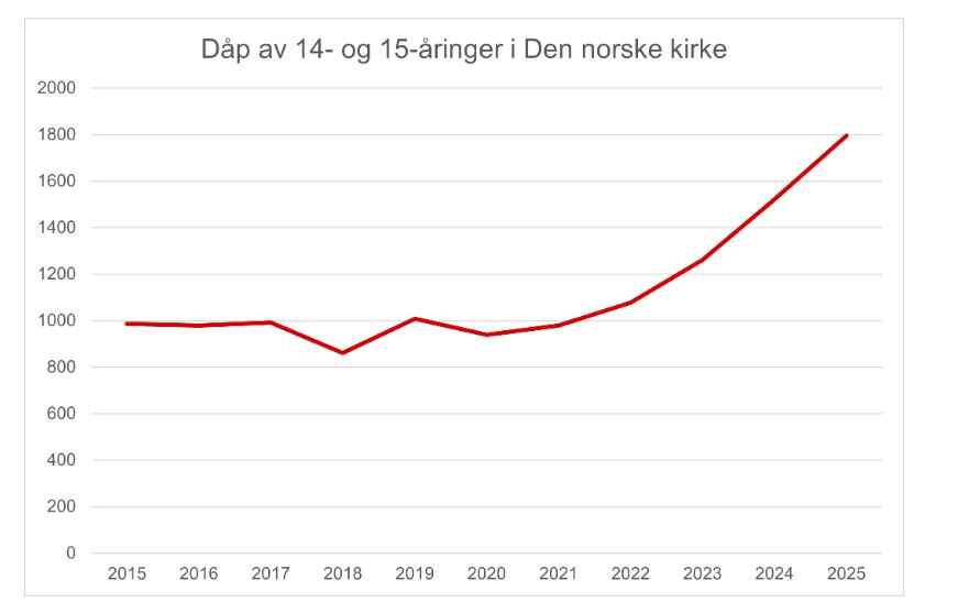 I alt ble 1796 14- og 15-åringer døpt i fjor, en økning på 18 prosent fra året før, og over 80 prosent flere enn for ti år siden, opplyser Kirken.