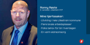 Ronny Røste har vært politisk aktiv siden han ble valgt som leder i Fet FrP i 1990. Han ble innvalgt i Lillestrøm kommunestyre etter over 30 års erfaring i politikken. Bildet er av en valgkampplakat.