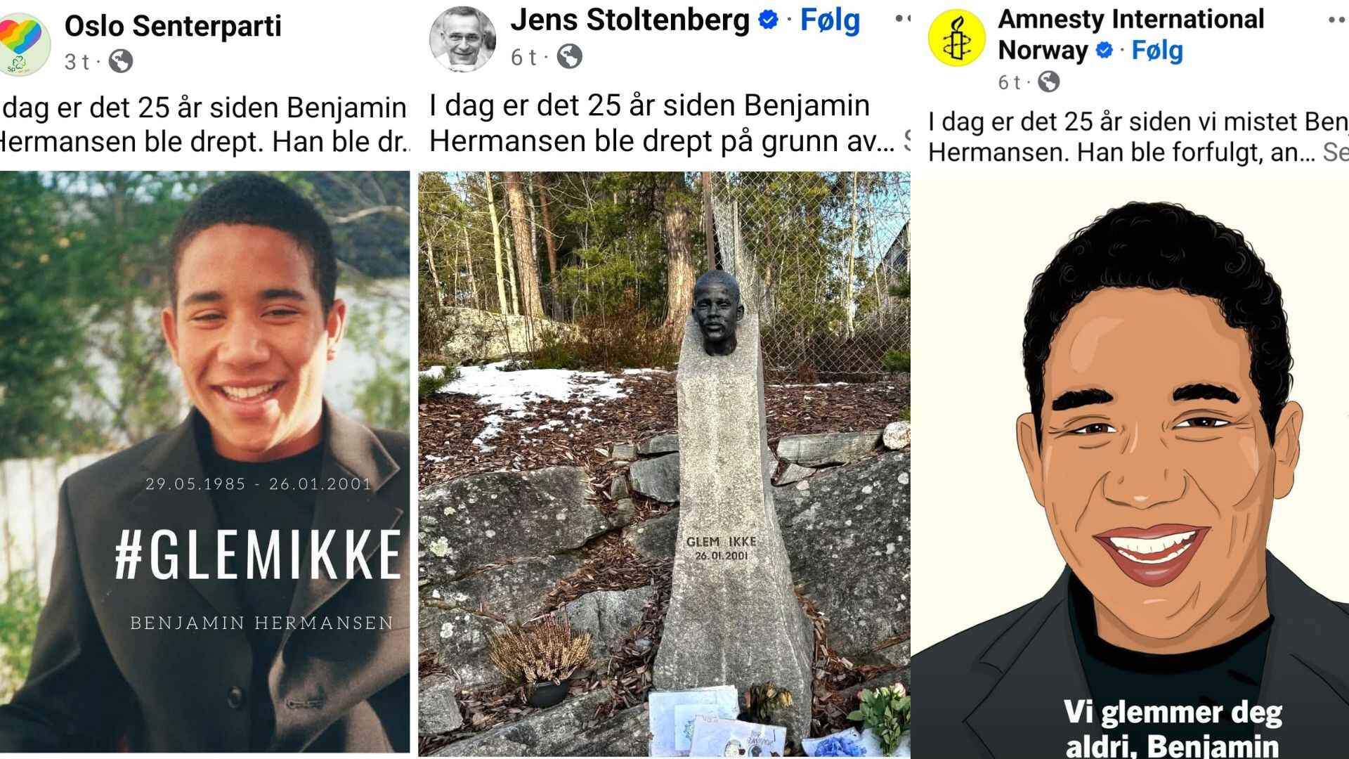 «I dag er det 25 år siden Benjamin Hermansen ble drept på grunn av hudfargen sin. Vi sto opp for mangfoldet da, men fortsatt ser vi at ekstreme holdninger fører til grusomme gjerninger. Benjamin hviler, men vi kan aldri få fred. Hans minne er for viktig til det», skrev Stoltenberg og delte tale han holdt i etterkant av drapet, det vil si som statsminister, den 1. februar 2001. Blant annet sa han da: