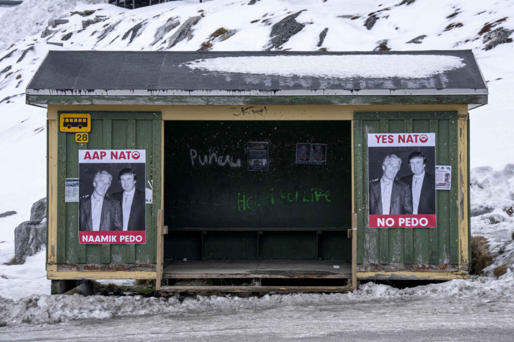 En plakat med et bilde av USAs president Donald Trump og Jeffrey Epstein som er satt opp på et busstopp i Nuuk, Grønland, 24. januar.