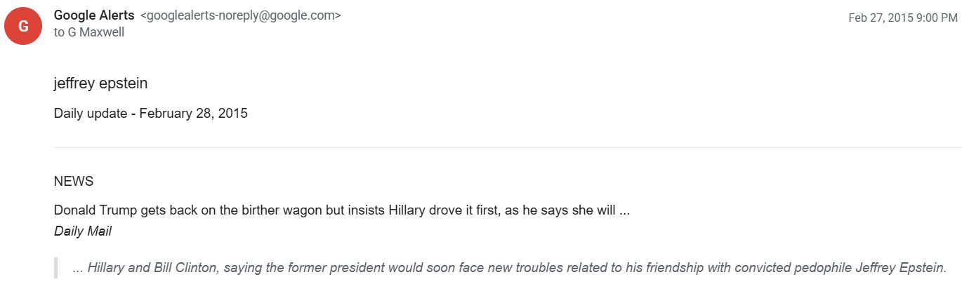 Clinton hadde kanskje ikke den samme klangen hos Epstein lenger. Årsaken var trolig en e-post fra Ghislaine Maxwell drøyt to måneder tidligere. Der varslet hun Epstein om at Donald Trump, som vurderte å stille som president­kandidat for Republikanerne, ville kunne skade Hillary Clintons kandidatur ved å trekke frem Bill Clintons vennskap med den dømte pedofile Jeffrey Epstein.
