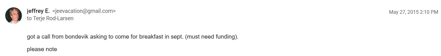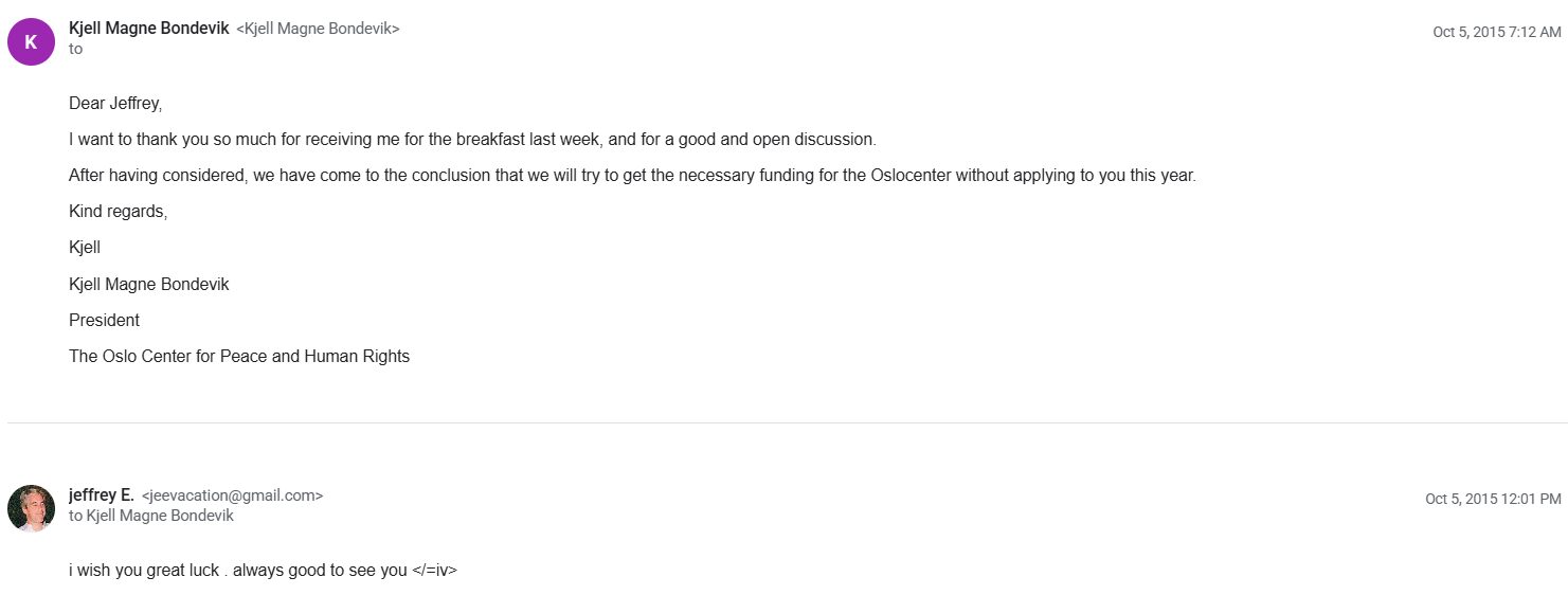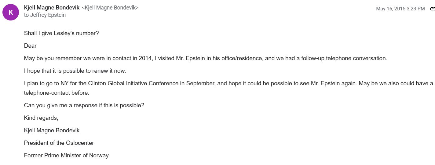 Hvilken diskusjon Epstein og Rød-Larsen har hatt om Bondevik, er ikke dokumentert. Men møtet mellom Bondevik og Epstein fant sted 28. september 2015. 18. september skriver Jeffrey Epstein til Bondevik: