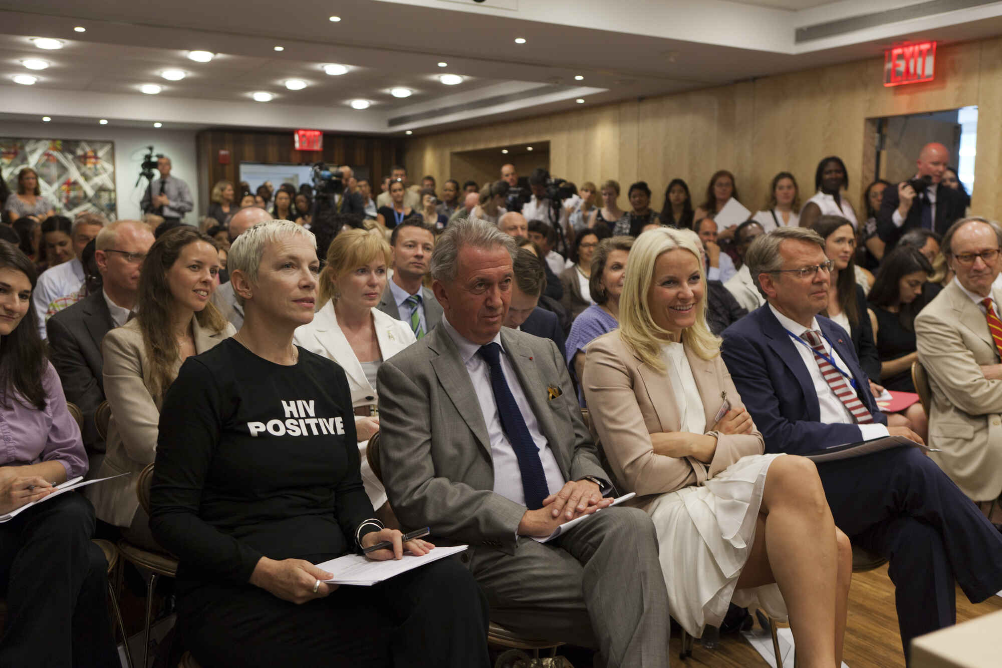 Annie Lennox, Terje Rød-Larsen, kronprinsesse Mette-Marit og Norges FN-ambassadør Morten Wetland på UNAIDS-konferanse i International Peace Institue Policy Forum i New York den 7. juni 2011. Foto: Johannes Worsøe Berg. Berg/NTB.