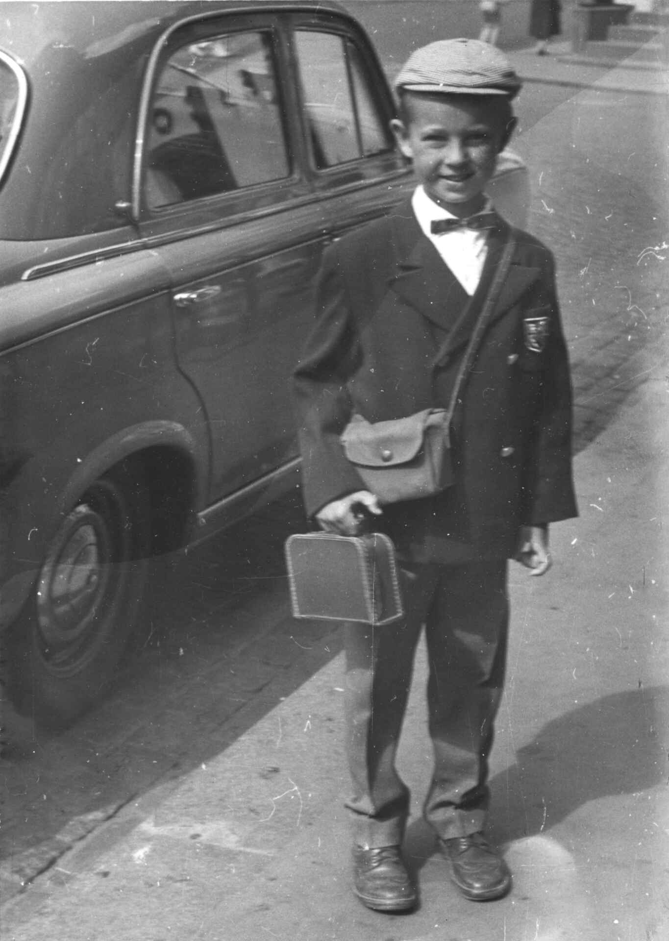 Tidlig forsøk på korrekt reiseeleganse, på kaia og klar for danskebåten i 1958. Legg merke til obligatorisk reiselue og forskriftsmessig reisekoffert (papp). (Foto: Sigrid Tholander)