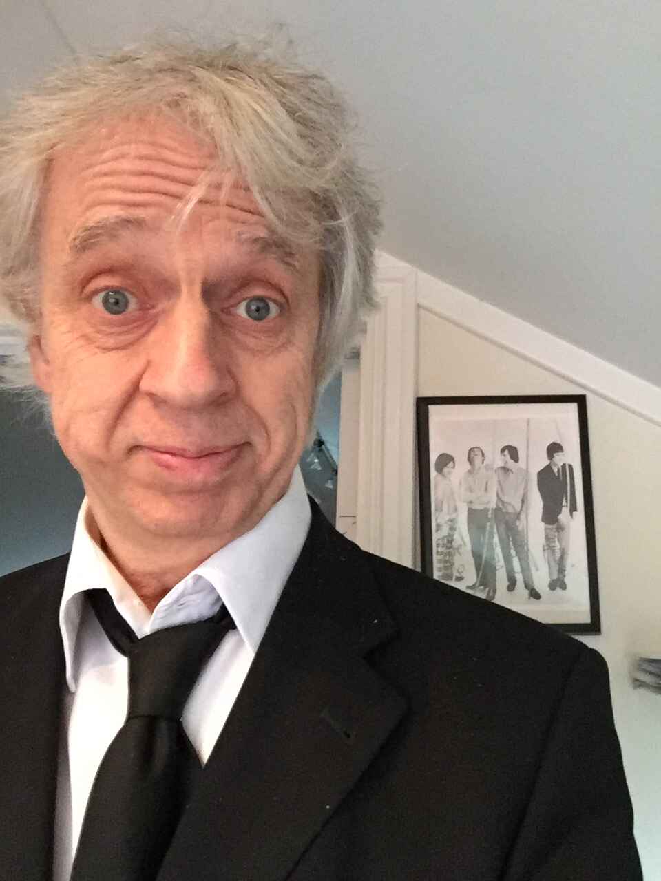 Ganske moderne forsøk på velkledd i 2020. Dressen er mørk som bare det, og ble anskaffet i Kina. Men dessverre: ingen sigar. Heldigvis trekkes oppmerksomheten vekk fra hovedmotivet og over mot det signerte fotografiet av The Kinks. (Foto: Strak-arm-productions 2.0)