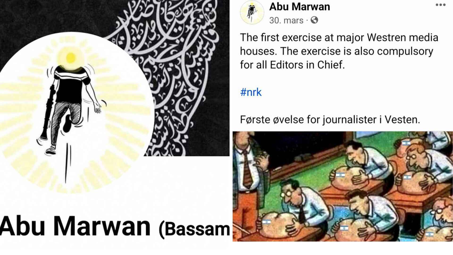 Tidligere hadde Bassam Hussein en Facebook-side der han gikk under navnet Abu Marwan. Der hadde han noe som lignet en Hamas-aktivist, eller terrorist, som profilbilde, på en bakgrunn der Israel er utslettet. Han uttrykte også noe norsk og vestlig skepsis. Skjermbilder fra 2024. Profilen synes nå å være slettet.