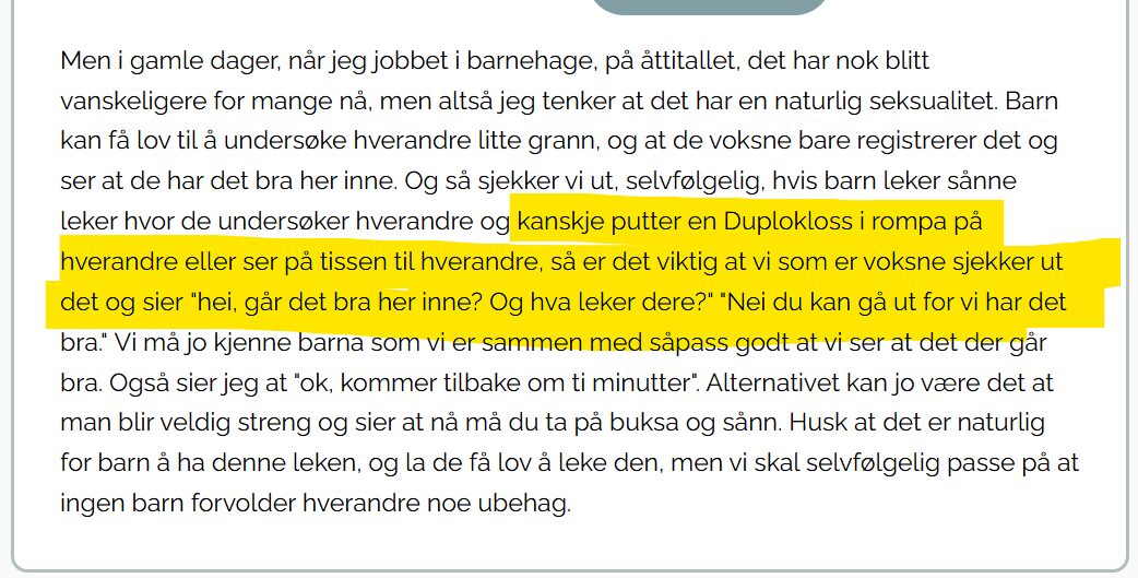 Men det stopper ikke der. I den samme veilederen beskriver Aasland hva som skal skje når barn leker seksuelle leker med hverandre – inkludert å «putte Duplo-klosser i rumpa på hverandre»: