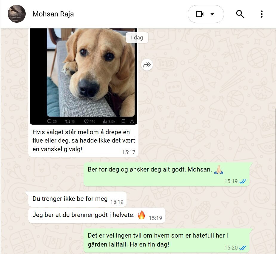 Raja skriver blant annet at han ønsker seg at Document-journalisten «brenner i helvete».