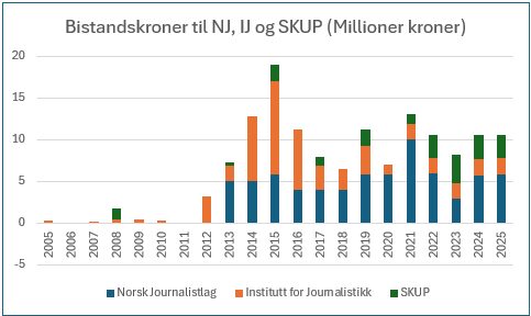 I 2025 mottok Norsk Journalistlag 10,5 millioner kroner over det norske bistandsbudsjettet. Siden 2013 har det påløpt 92 millioner bistandskroner. I tillegg har Institutt for Journalistikk og SKUP-stiftelsen mottatt bistandsmidler fra Norad som bringer totalen opp i 141 millioner kroner. Dette er mer enn International Peace Institute mottok under Terje Rød-Larsen, og må ikke forveksles med pressestøtte.