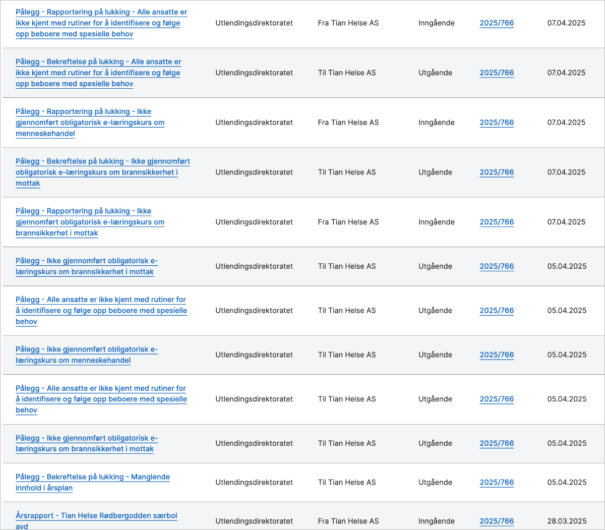 Offentlig postliste som viser kommunikasjon mellom UDI og Tian Helse om brudd på obligatoriske rutiner ved mottaket på Rødbergodden i april 2025.